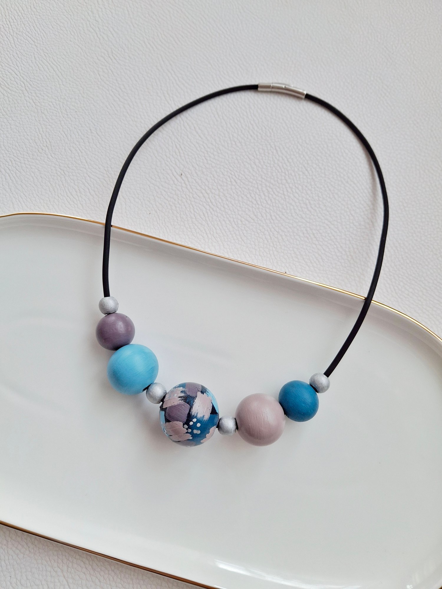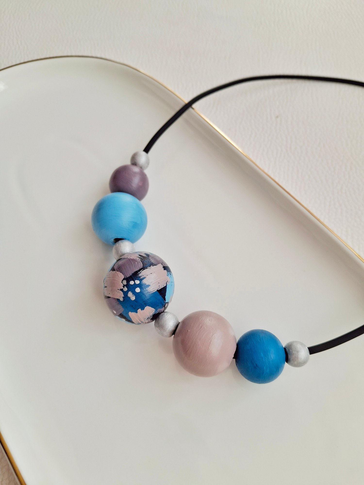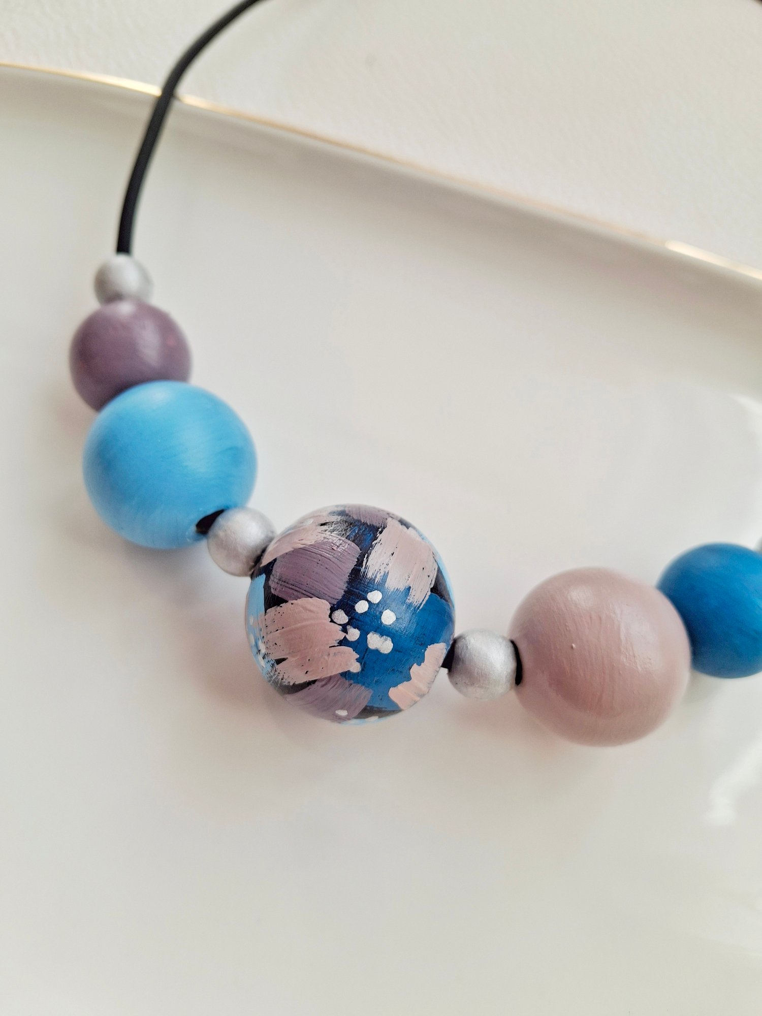 Un incredibile pezzo unico questa bellissima collana con perle in legno naturale tutte dipinte a mano, per una filosofia di grande esclusività.