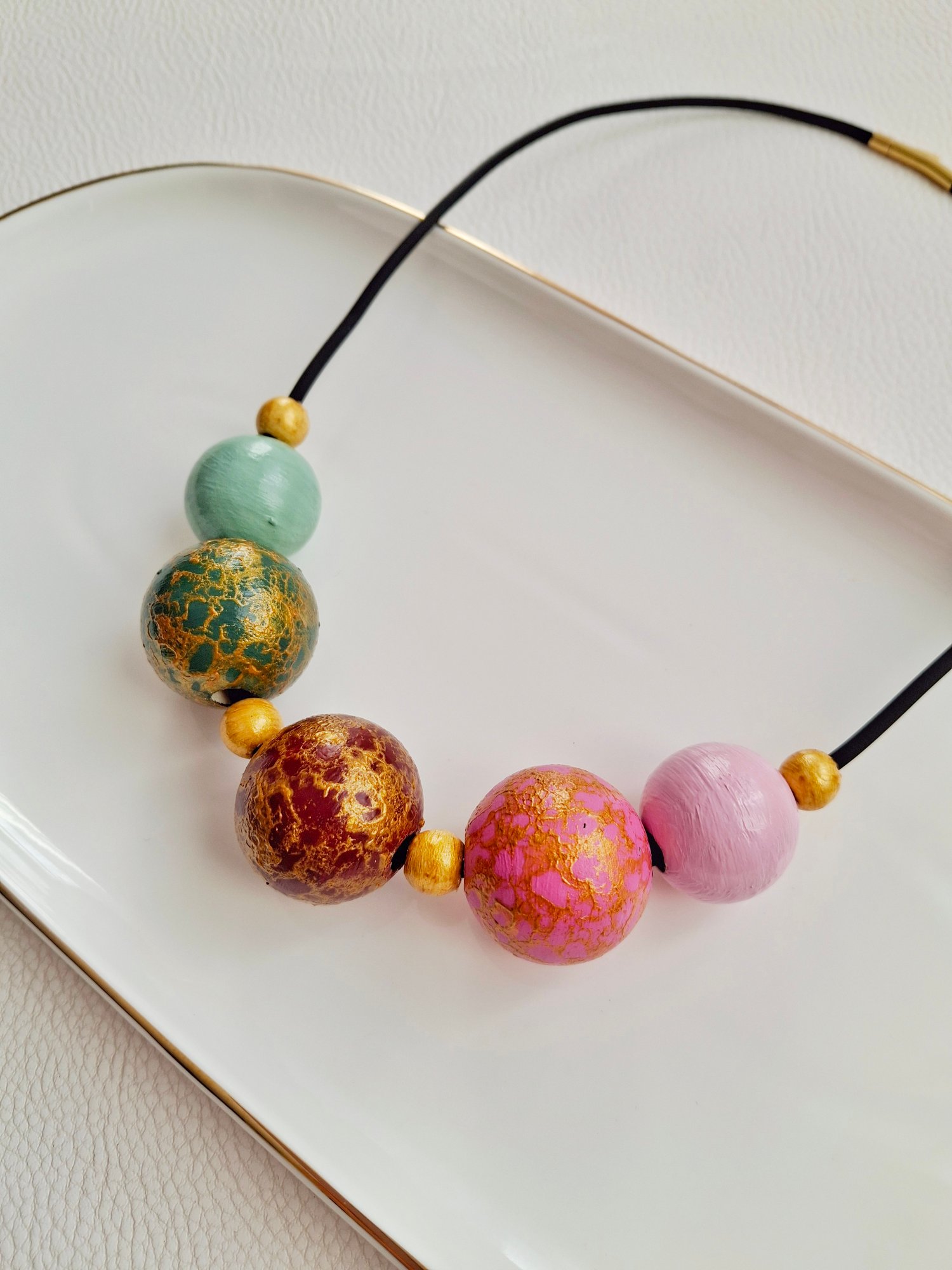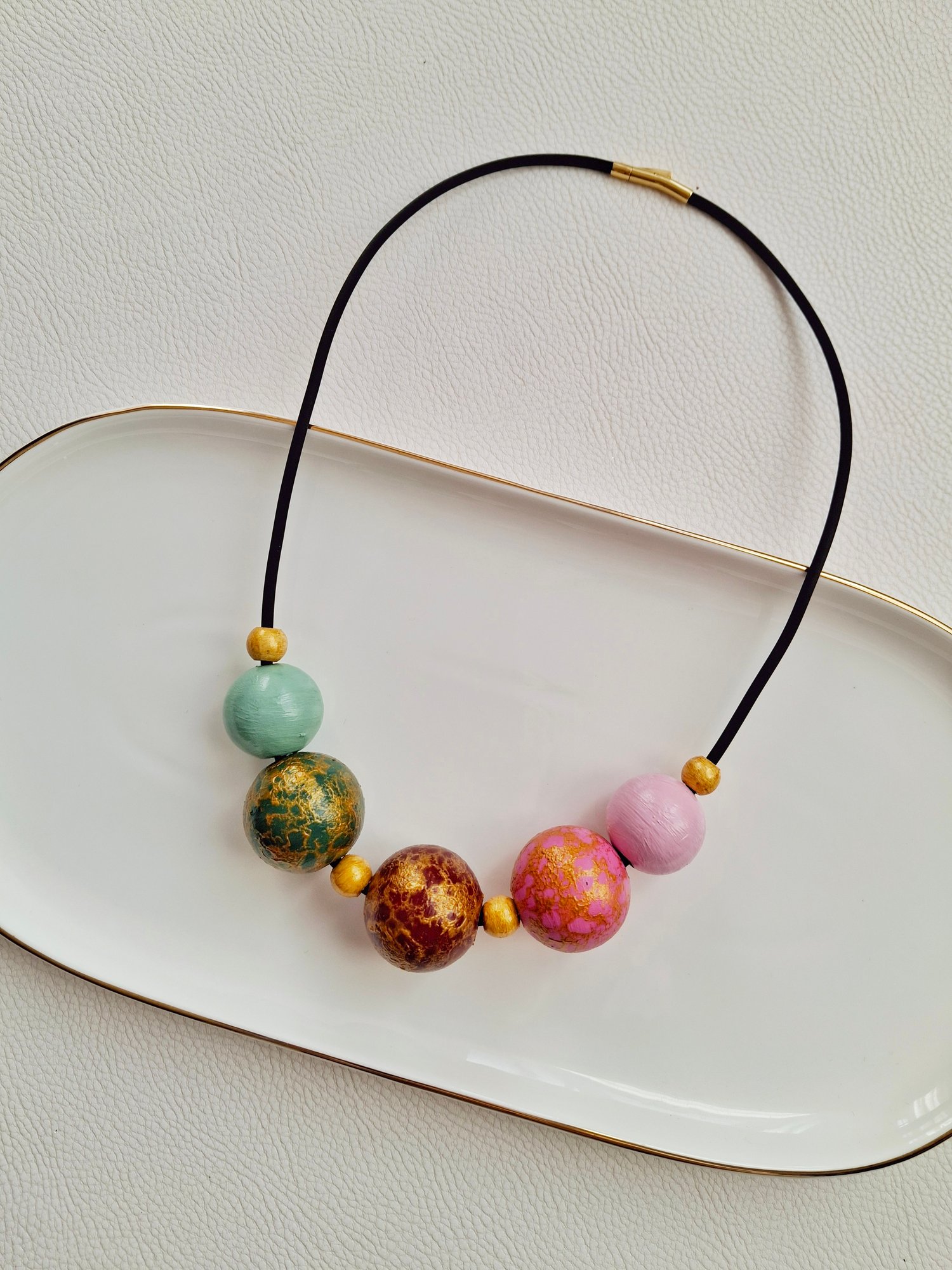 Un incredibile pezzo unico questa bellissima collana con perle in legno naturale tutte dipinte a mano, per una filosofia di grande esclusività.