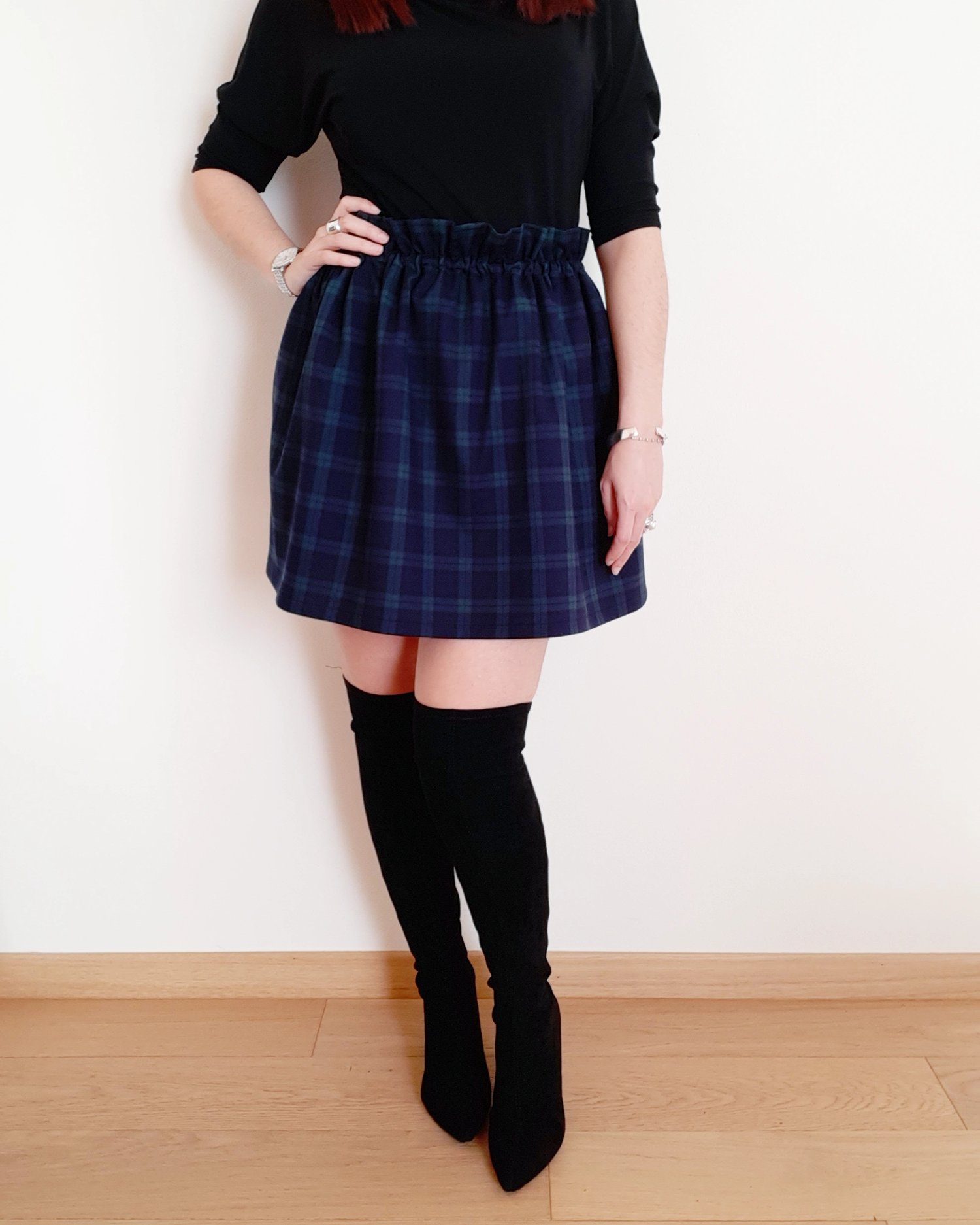 Gonna realizzata artigianalmente a mano e su misura da me, nel modello con elastico esterno a cintura, elastico interno, galetta, balza increspata, pieghe e tubino, in un bellissimo tessuto tartan dai classico toni di colore verde inglese e blu.
