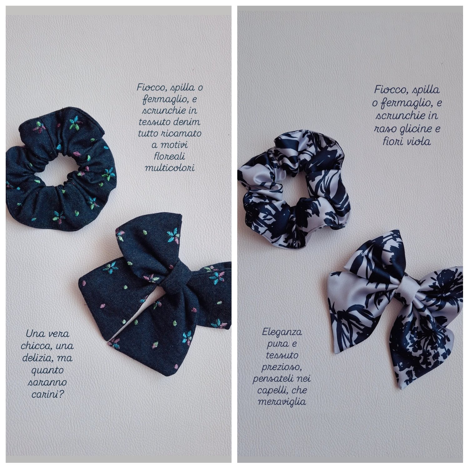 Uno scrunchie e un fiocco entrambi realizzati a mano, con un tessuto Made in Italy.